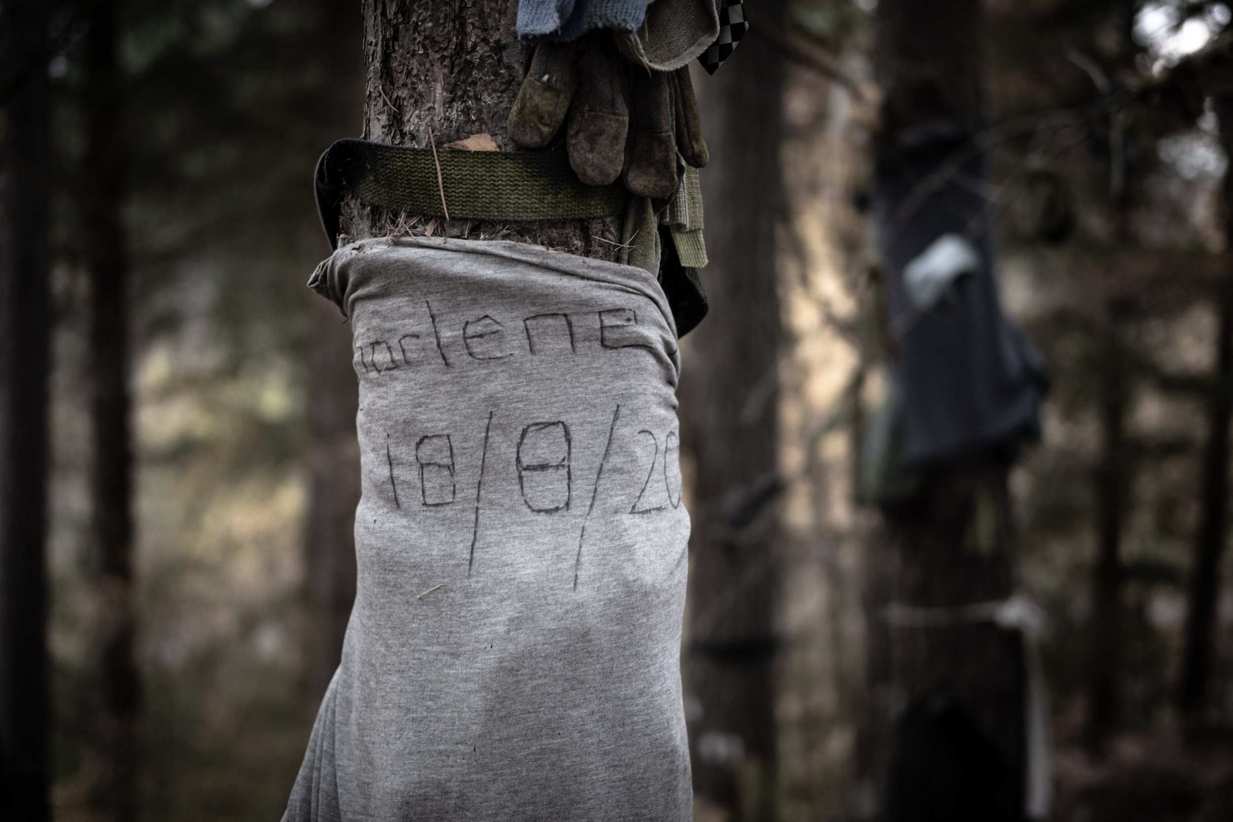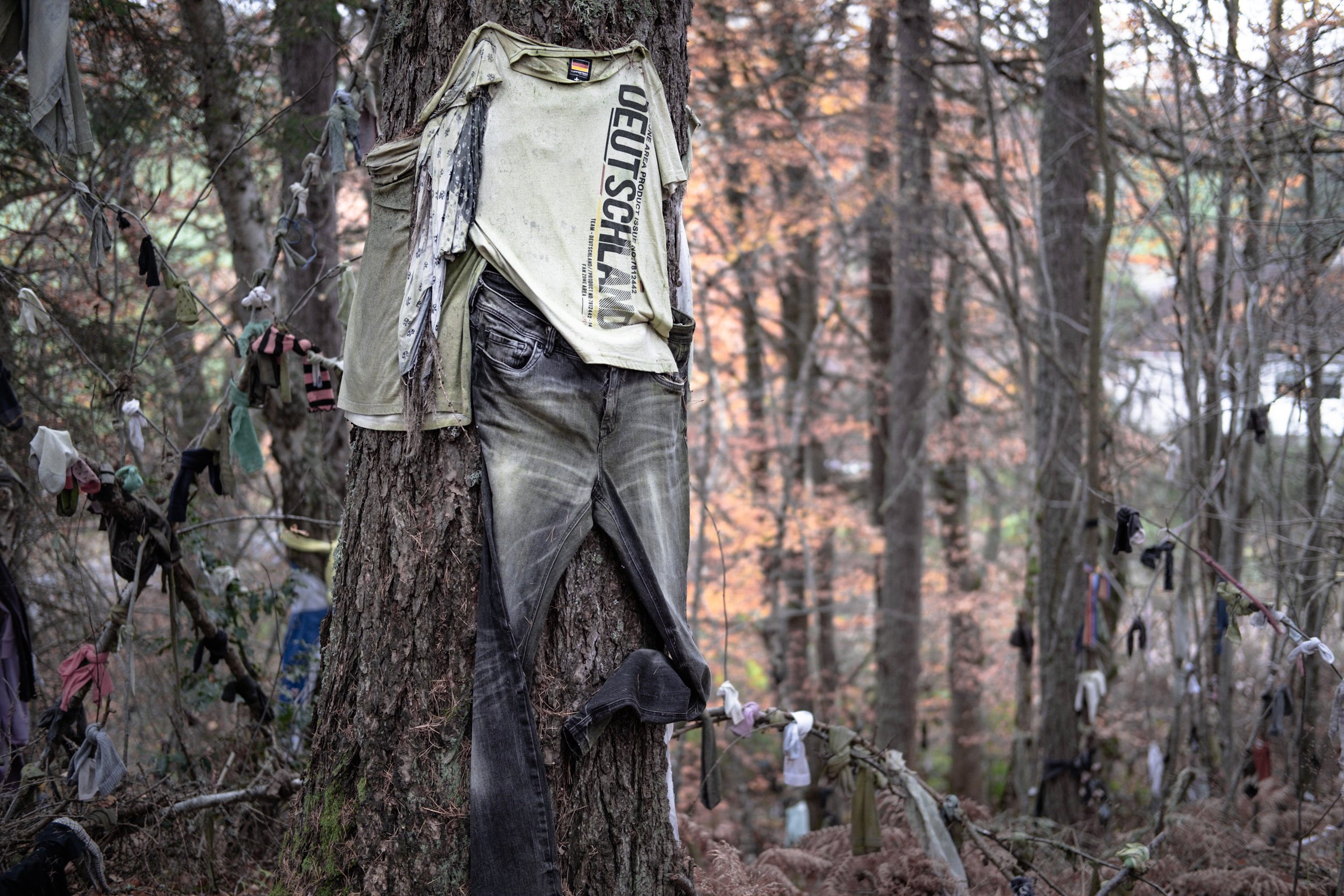 And so I returned last November with a camera in hand, to try and show this through the objects that hang from these sacred trees. The objects themselves have evolved*. No longer just strips of cloth, but often sacrifices of more fully formed items of clothing. Everywhere I looked, human forms either in their entirety or in more grisly disembodied forms emerged from the forest.